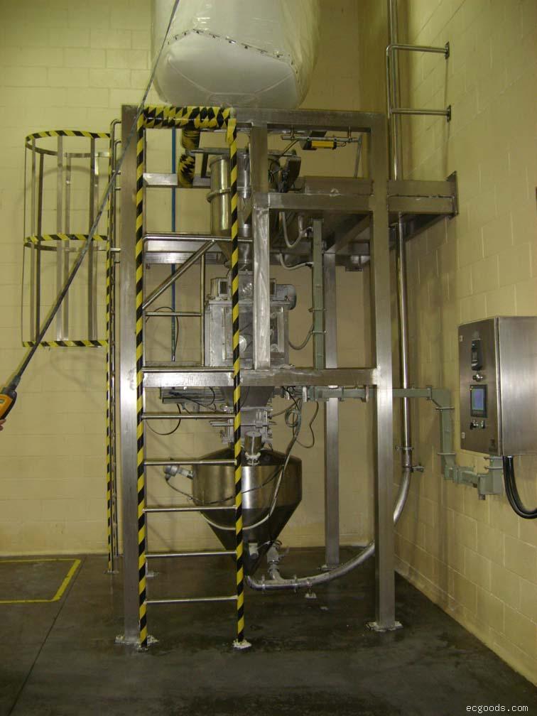 噸包拆包機卸載方式主要分為兩種:一種是大袋開袋后和大袋卸料站叉車將大袋(或噸袋)吊裝到卸料機的機架上,它本身不帶起重設(shè)備,二是大袋開袋站和大袋卸料站是靠自身的起重設(shè)備將大袋(或噸袋)吊裝到卸料機的機架上,不需要外界的幫助,它通過提升噸袋至設(shè)備進料口,人工拆開噸袋下料口,打開流量閥并附以拍打、振動、破碎等裝置,促使袋內(nèi)的粉粒狀物料靠重力落進料倉來完成拆包卸料工作,整個過程是全自動控制,系統(tǒng)操作穩(wěn)定,能完成連續(xù)拆包的任務(wù),操作過程簡單方便,通過相關(guān)實驗結(jié)果可知,拆完一包料的時間大約是5-6分鐘,領(lǐng)先于國內(nèi)大多機械設(shè)備生產(chǎn)公司。